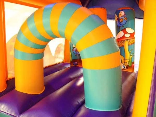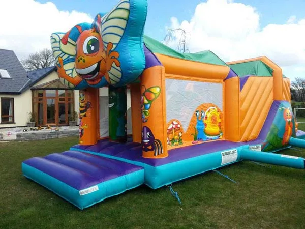 A semi-enclosed bounce house with attached slide. Ideal for narrower gardens and provides excellent shelter from light rain.