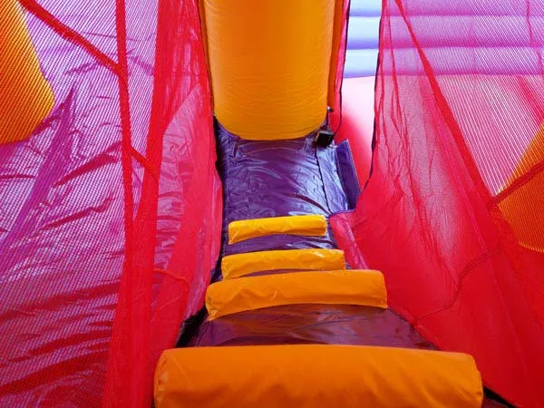 A semi-enclosed bounce house with attached slide. Ideal for narrower gardens and provides excellent shelter from light rain.